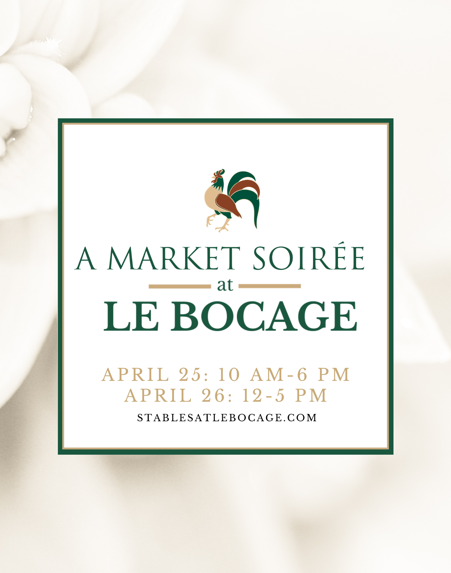 A Market Soirée at Le Bocage will take place April 25–26 at Le Bocage.